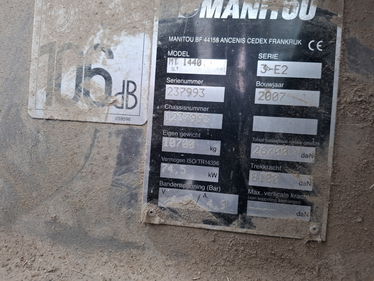 TYLKO 3965 mtg, Ładowarka teleskopowa MANITOU MT 1440 SLT, 2007 r, silnik PERKINS 100 KM, 4x4x4, REWERS w joysticku, ogrzewanie i wentylacja, napęd mechaniczny, mechaniczna skrzynia z 4 biegami, trzysekcyjna hydraulika na joysticku, przednie podpory, przechył hydrauliczny