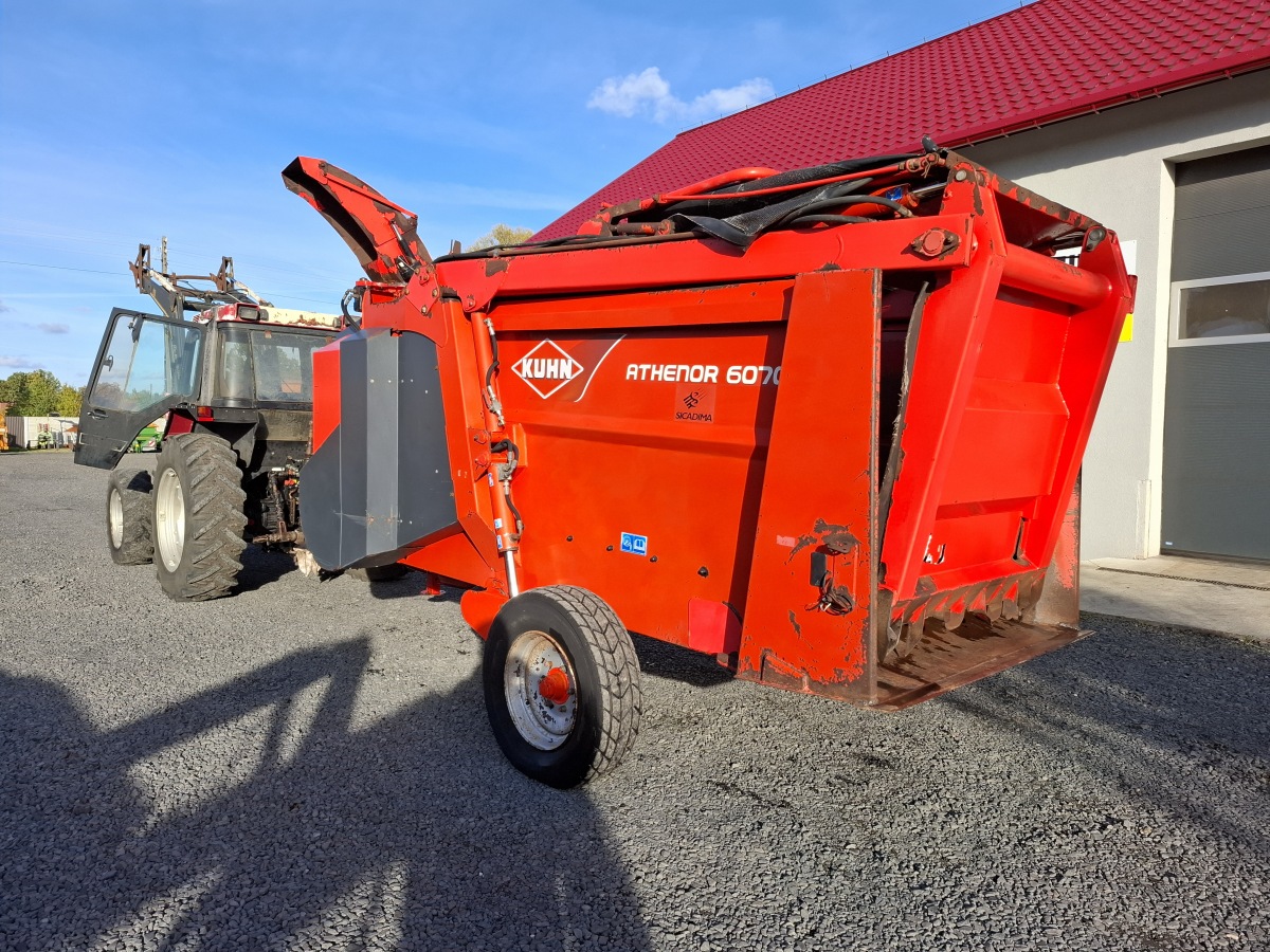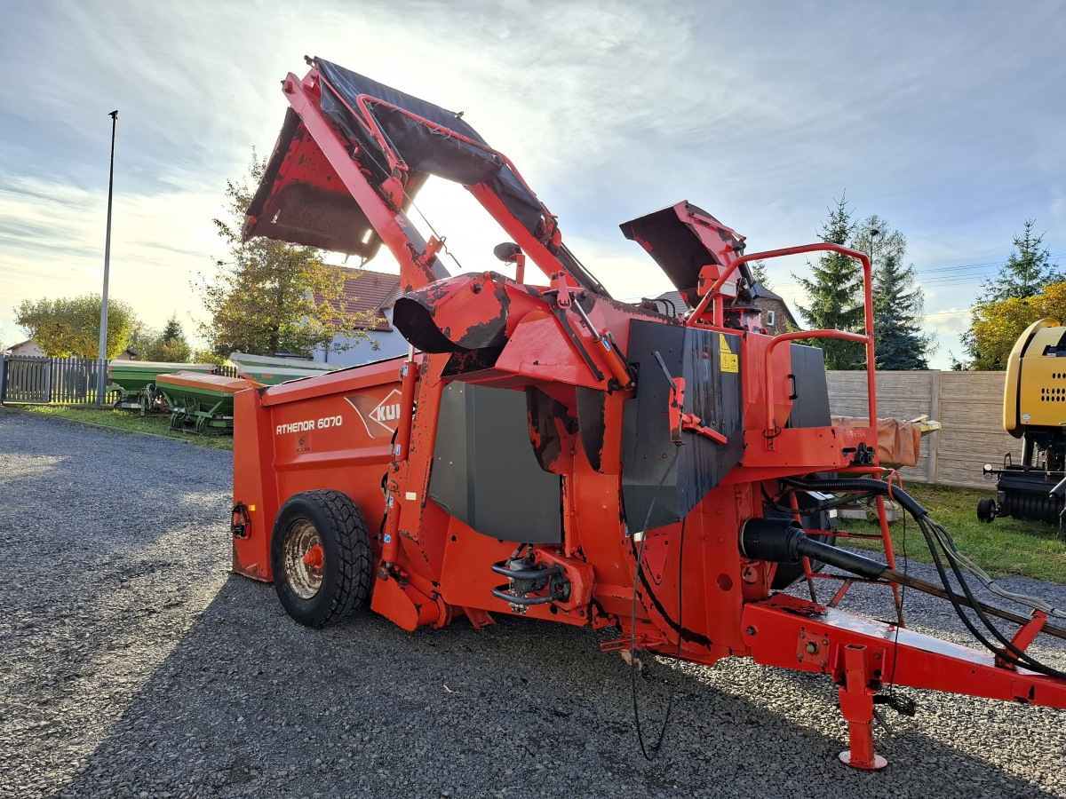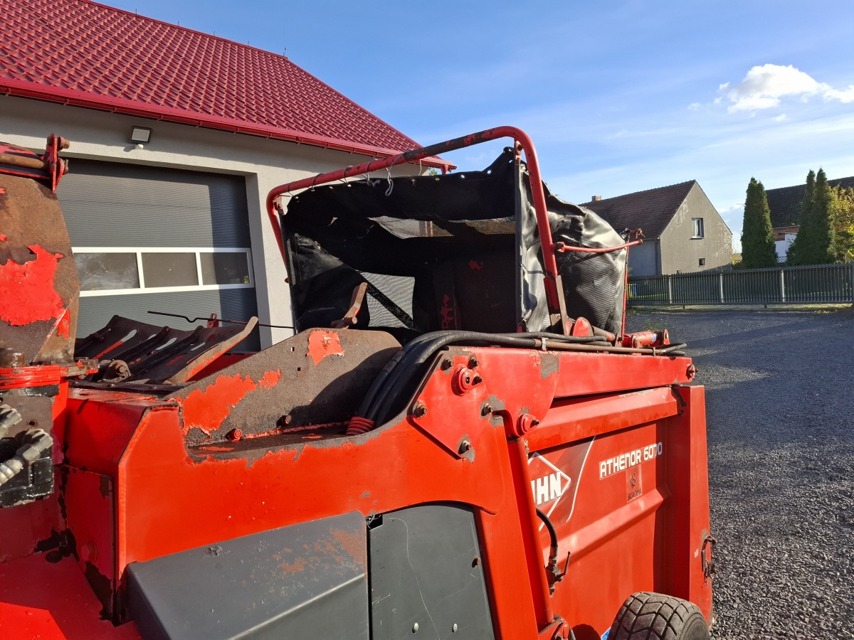 ŚCIELARKA ciągana KUHN ATHENOR 6070, 6 m3, 2007 r, ścielarka do słomy, bardzo uniwersalne maszyna. Może być ładowana od góry albo od tyłu. rura wysypowa OBROTOWA regulowana i druga boczna, Posiada dwa wały- frezy do rozdrabniania BALOTÓW SIANOKISZONKI. Posiada też rozkładany hydraulicznie parawan do mieszania paszy. Może też służyć do ścielenia słomą na ok 10m. Posiada szerokokątny wałek przekaźnika. Sterowanie z kabiny ciągnika. Kompletna sprawna i działająca maszyna.