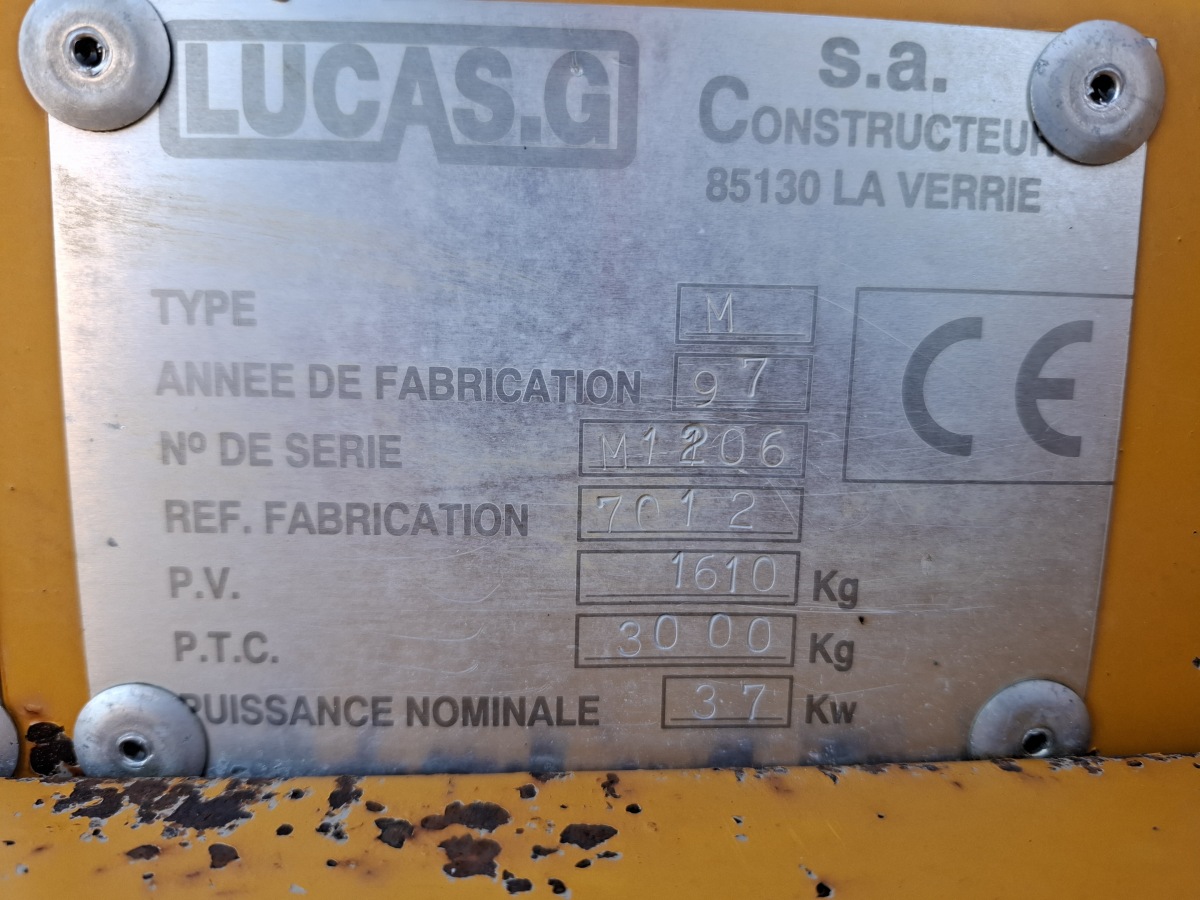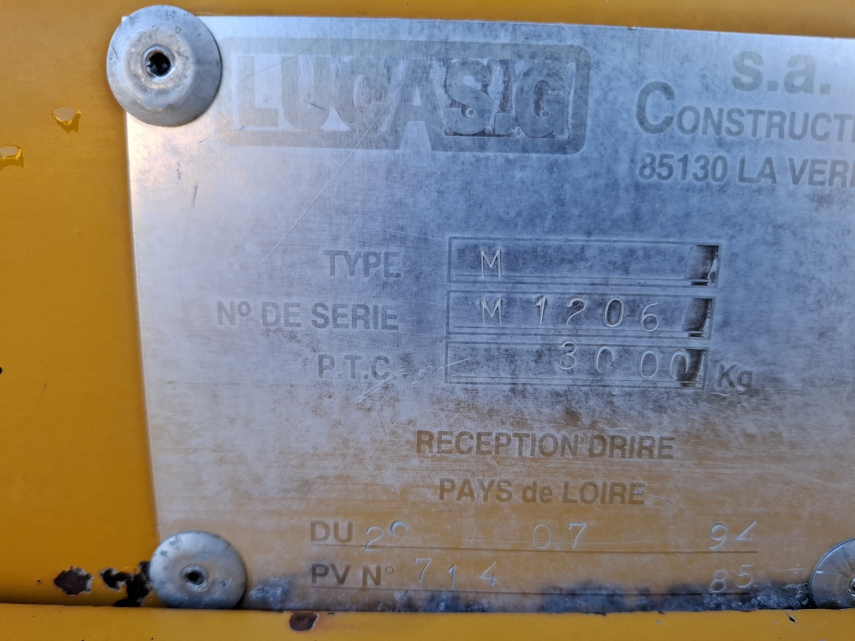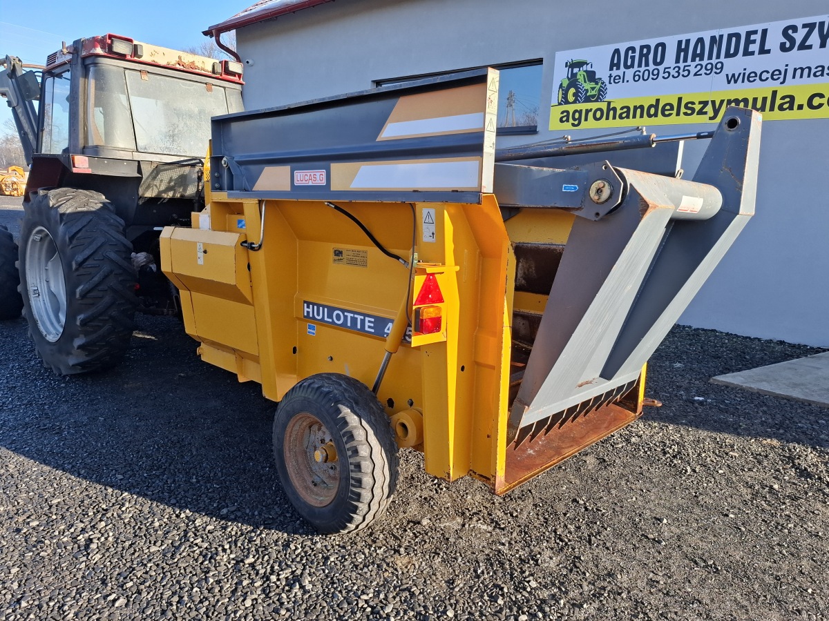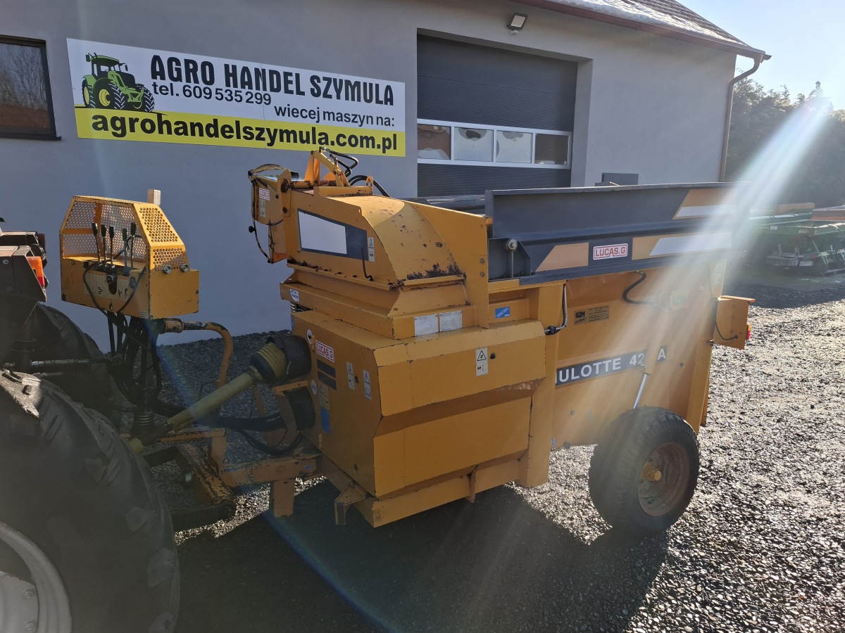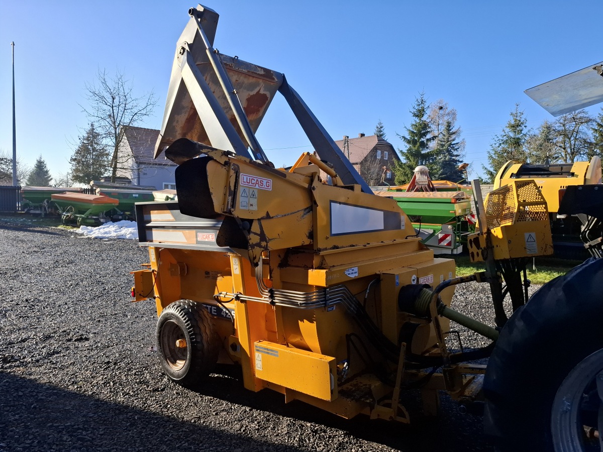 ŚCIELARKA ciągana LUCAS HULOTTE 425 A, 4,2 m3, 1997 r, ścielarka do słomy, bardzo uniwersalne maszyna. Może być ładowana od góry albo od tyłu. rura wysypowa regulowana, Posiada wał- frez do rozdrabniania BALOTÓW SIANOKISZONKI. Może też służyć do ścielenia słomą na ok 10m. Posiada wałek przekaźnika. Sterowanie z kabiny ciągnika. Kompletna sprawna i działająca maszyna.